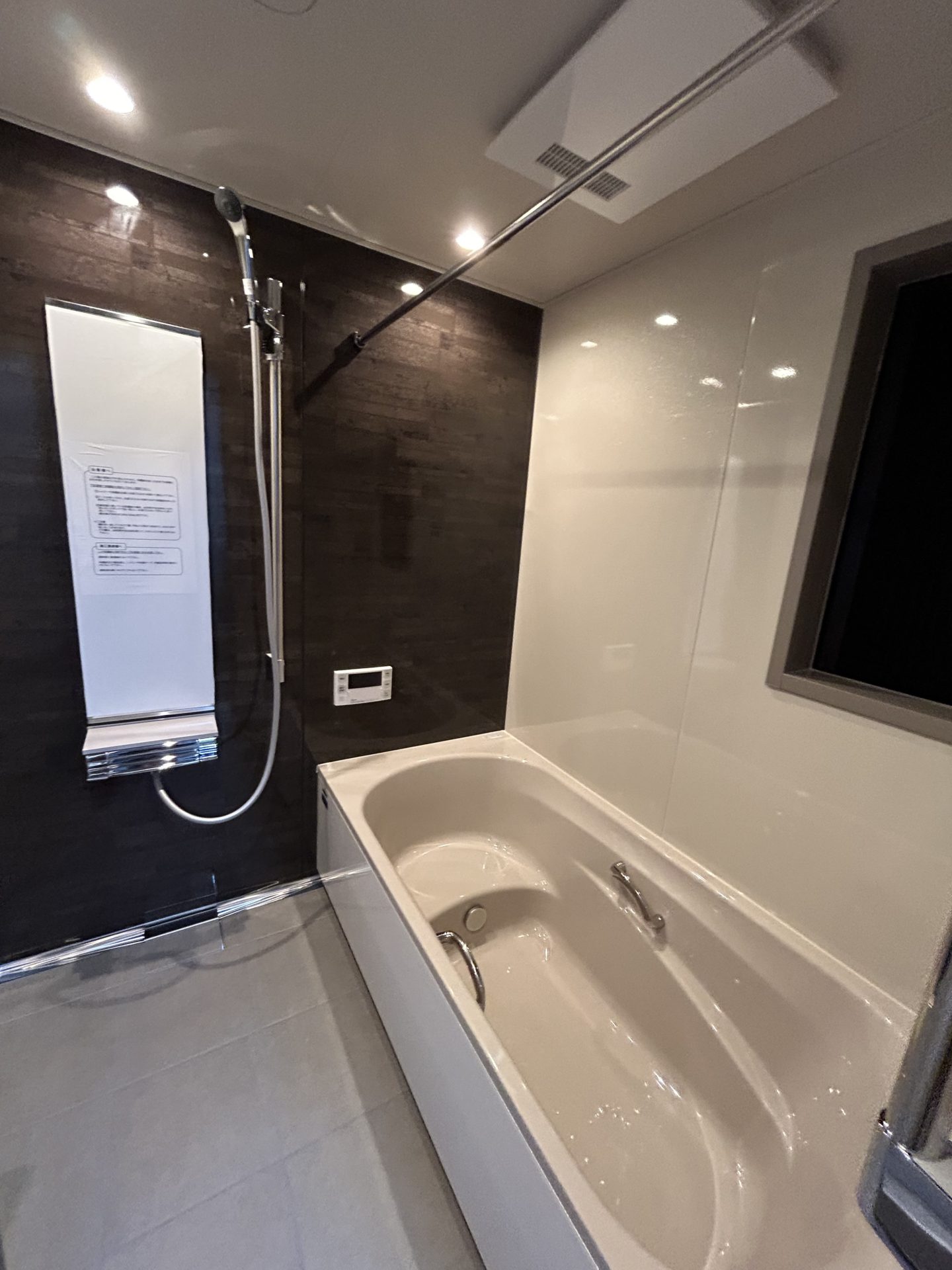 タイル貼りで冬場の冷え込みやお手入れの手間が気になっていた浴室には、タカラスタンダードのシステムバス「グランスパ」を採用しました。壁面には落ち着いた雰囲気のブリックダークのアクセントパネルをあしらい、浴槽は肌なじみの良いパールベージュに。さらに、掃除の負担を軽減するパッキンレスのキープクリーンドアも嬉しいポイントです。機能性とデザイン性を両立した快適なバスルームになりました。