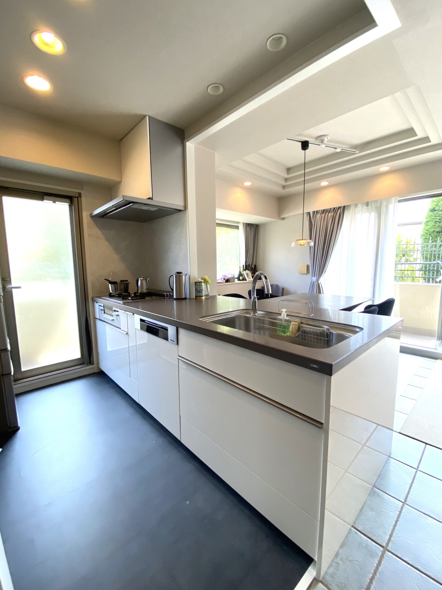 デザインは落ち着いたグレートーンでまとめ、空間全体にモダンでホテルライクな印象をプラス。 キッチンがリビングの一部として自然になじむ、美しい空間に生まれ変わりました。