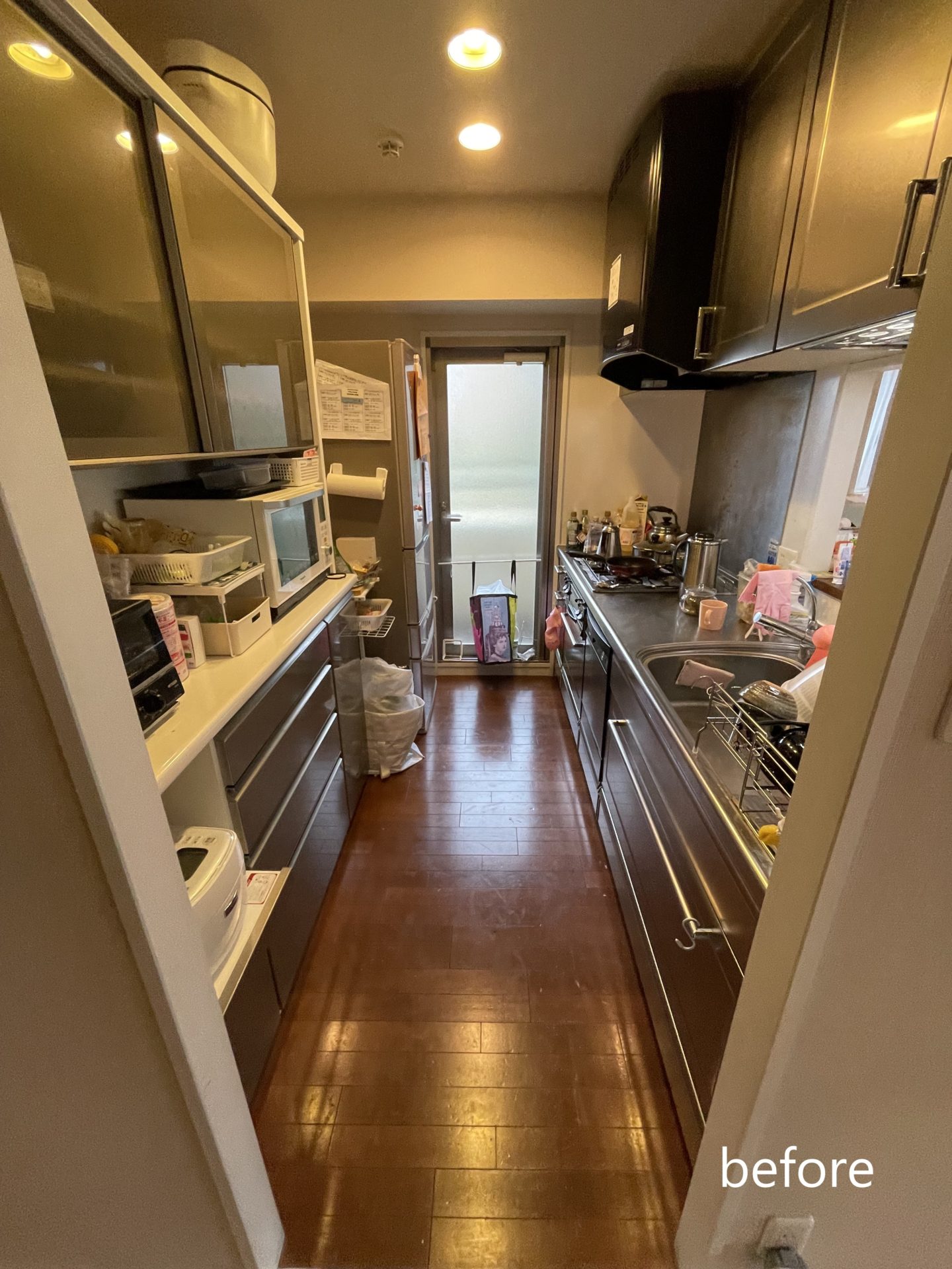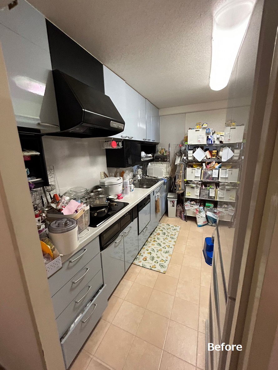 「家族と向き合える対面キッチンにしたい」という長年のご希望を叶えるため、吊戸棚・壁をすべて撤去し、対面型に変更しました。
