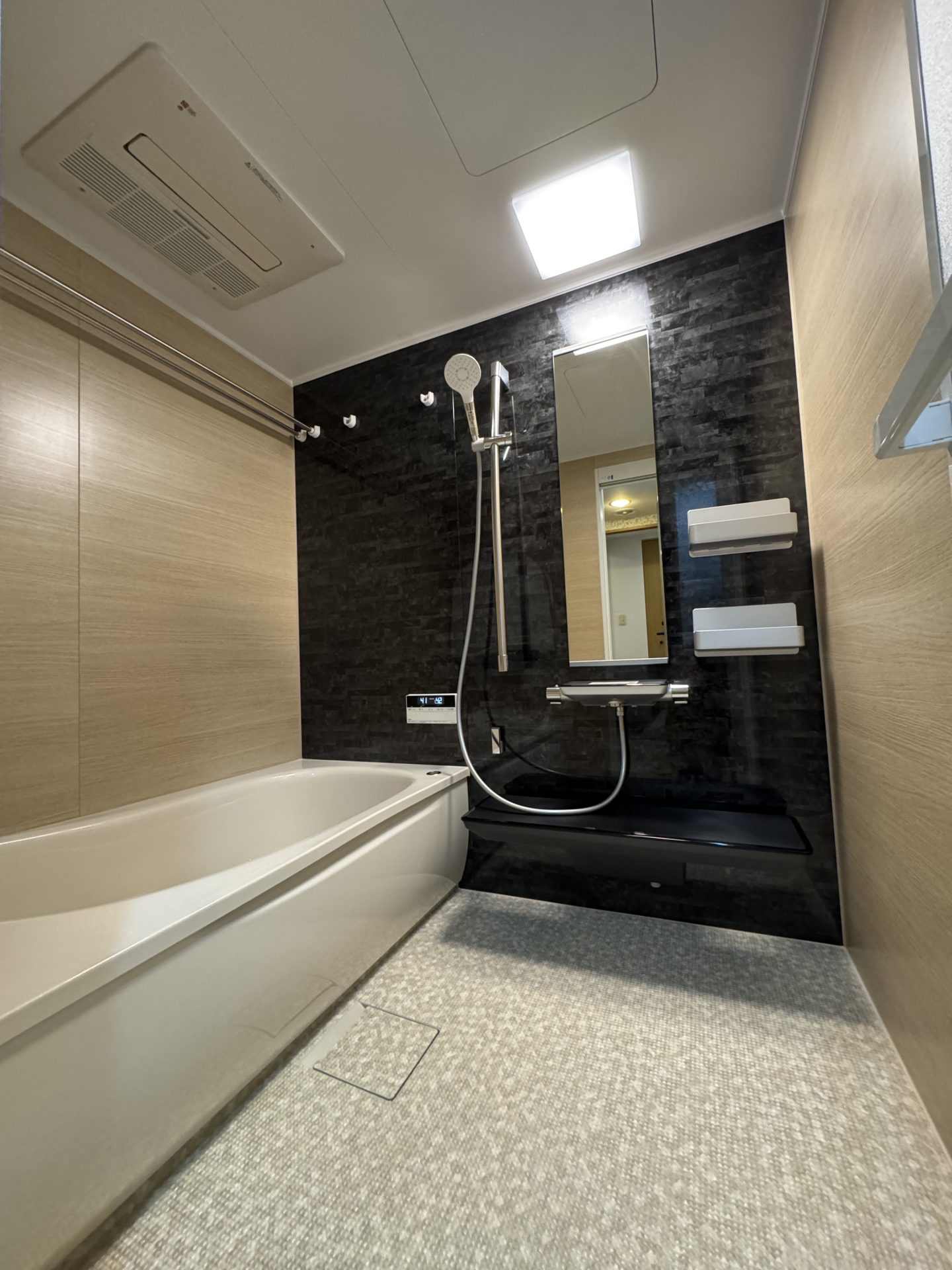 浴室はTOTO「マンションリモデルWYシリーズ Xタイプ」を採用。コンパクトなスペースでも足を伸ばせる広々浴槽に。黒×ナチュラルウッドのアクセントパネルで、落ち着きのあるモダンな空間へ。