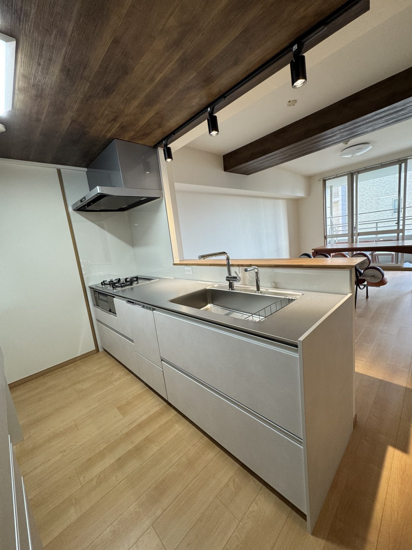 キッチンには美しいカウンターが特長のTOTOザ・クラッソを採用し、既存の柱に合わせてぴたりと納める工夫を施しました。LD側にはワイングラス用のキャビネットを造作するなど、ご夫婦の「好き」が凝縮された空間です。