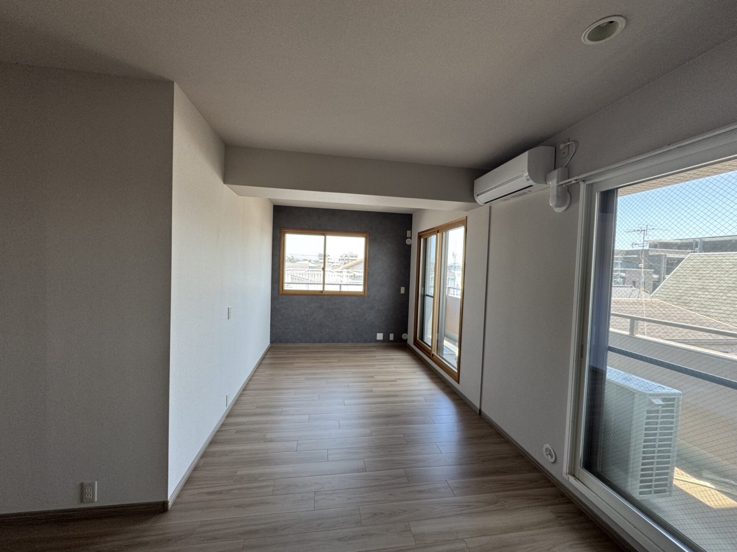 寝室にはビビッドな柄の壁紙、LDKには落ち着いたグレーのアクセントクロスを採用。空間ごとに気分を変えながら過ごせるよう、色によるメリハリをつけています。