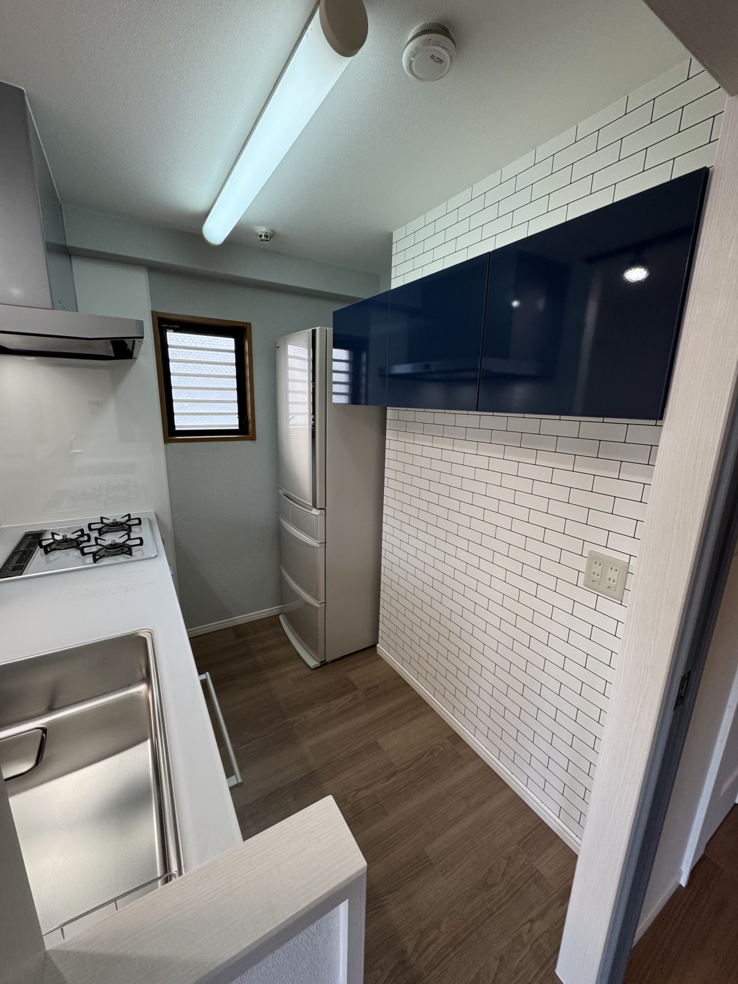 背面にはネイビー(パラネイビー)のカップボードを設置し、空間のアクセントに。白いタイル柄の壁紙(RE55660)との相性も抜群で、メリハリのあるインテリアに仕上がりました。食洗機はフロントオープンタイプで、パネルとの納まりも美しく、デザイン性と使いやすさの両立が実現されています。