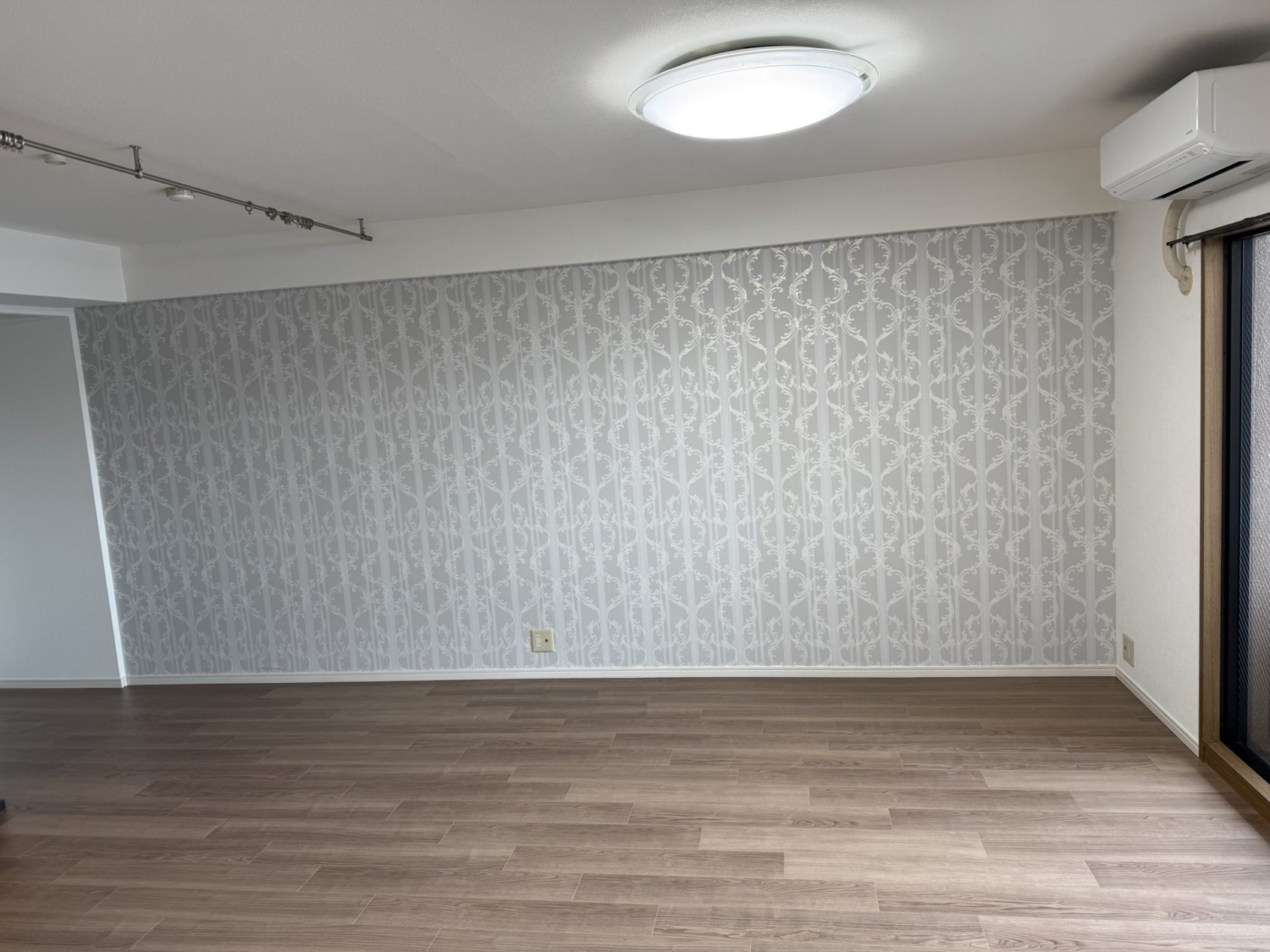 LDKは床にPanasonic「ウスイータ」シリーズのエイジドチェスナット柄を採用し、既存の床に上貼り施工。木目が美しく落ち着いた印象で、空間全体にやさしく馴染みます。お部屋の印象を大きく左右する壁紙も、アクセントクロスにRE55909(サンゲツ)を選定。上品なグレーに繊細な柄が映える、シックで華やかな空間となりました。