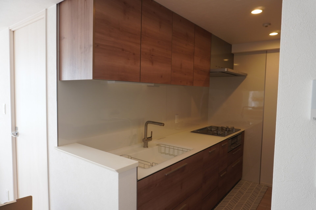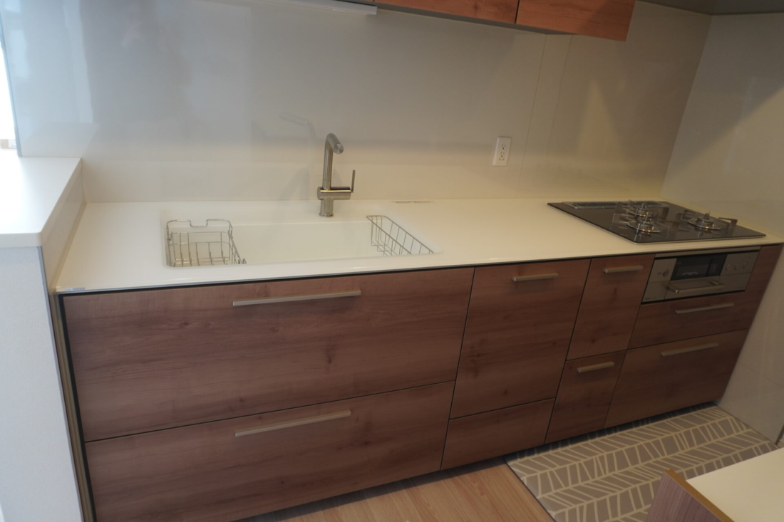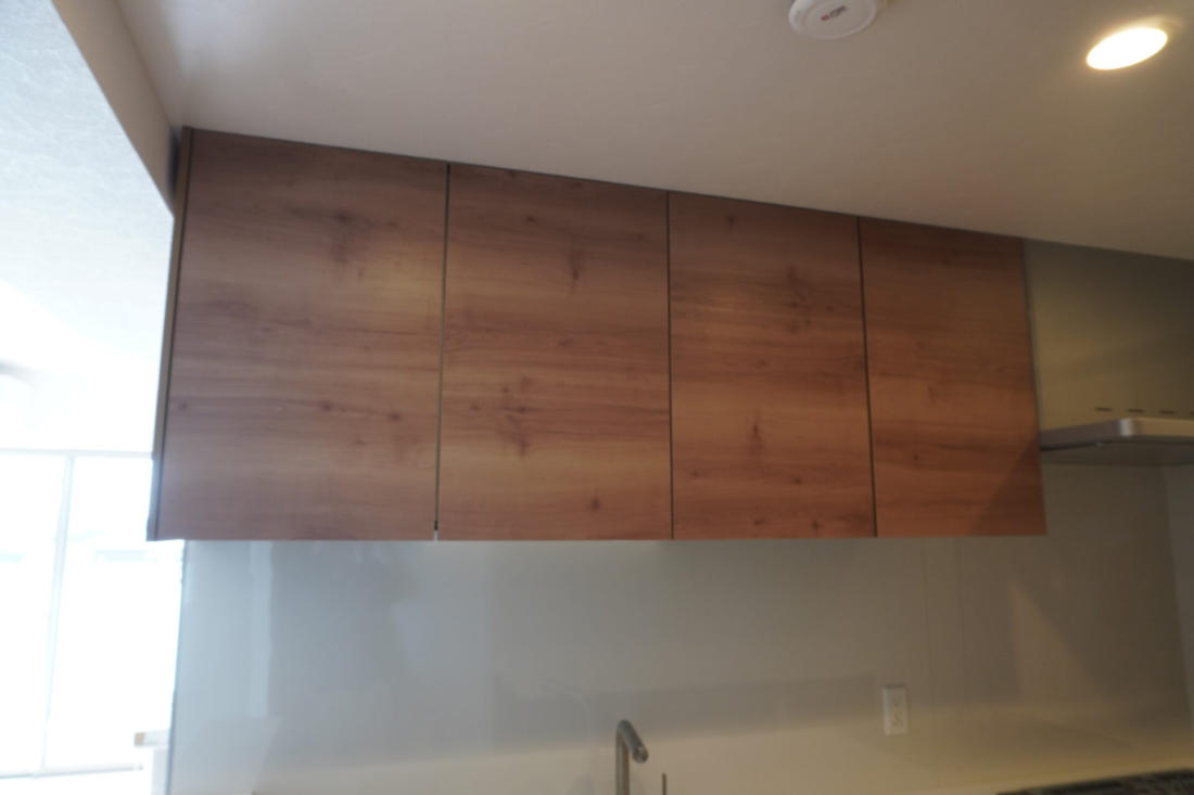 吊戸棚もあり収納はたっぷり。モダンな木目にシンプルな取っ手がマッチしてお洒落です。