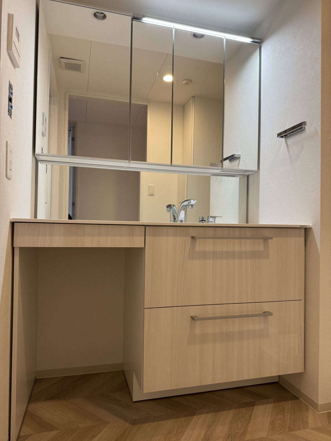 今の洗面台の中段に鏡をいれてもらったのも、ちょうど子供の目線の高さになって良かったです。