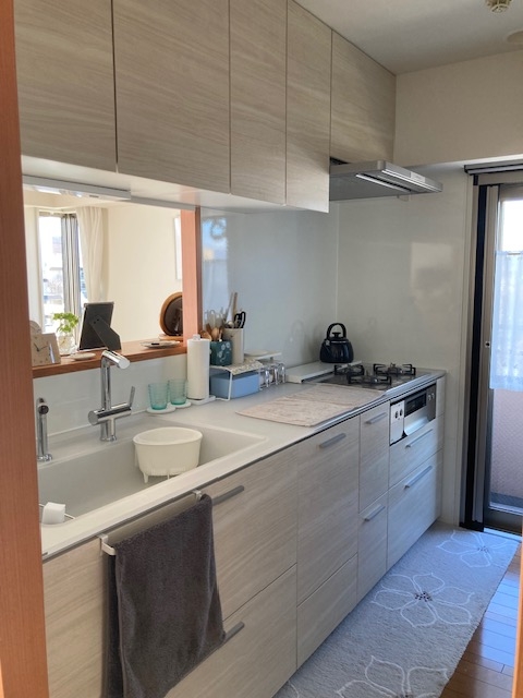 キッチンの中でもっともこだわったのが吊戸棚の収納です。昇降式の収納機能がとても使いやすく、気に入っています。