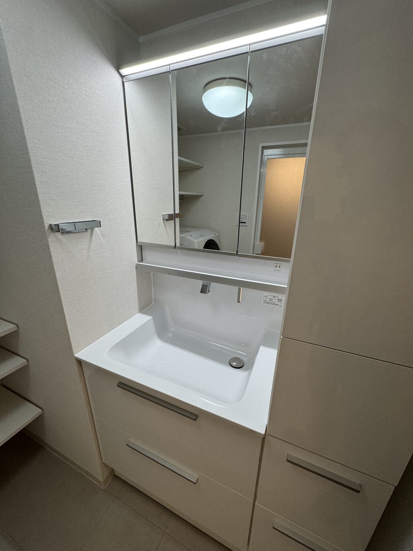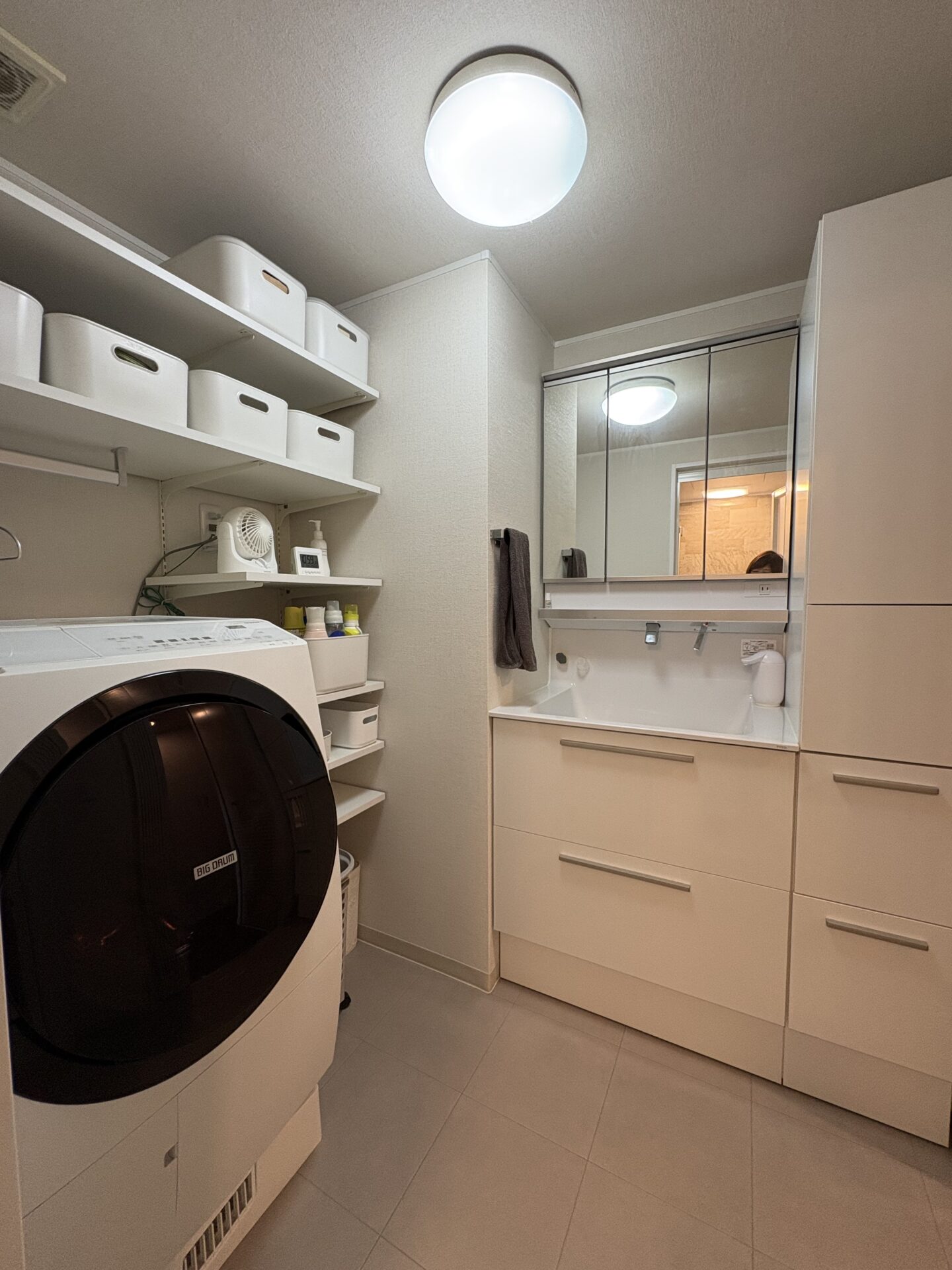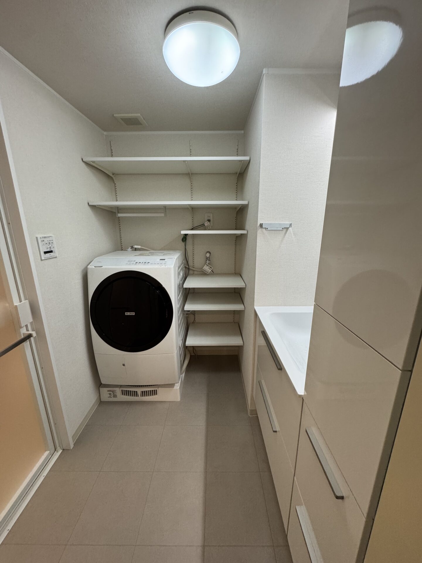 計算された収納棚と、洗濯パンがきっちりサイズになるだけですっきりします。