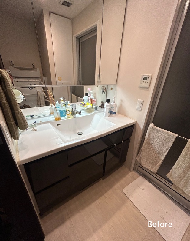 T様は、年に1度の弊社の自社イベントにご来場下さりその時に洗面化粧台の洗面ボールにヒビがいっていることから取替のご相談をいただきました。洗面ミラーはそのままで下台のみ取替させていただきました。一緒に床も選定いただいた際に、すぐ、「モロッカンだ!」と奥様。「これにします!」即返でした。化粧台はお気に入りのタカラ リジャスト。お好きなもの、お好みのものがピタッと見つかるととても伝わります。キッチンの水栓も取替させていただきました。お気に入りのものはそのままで。