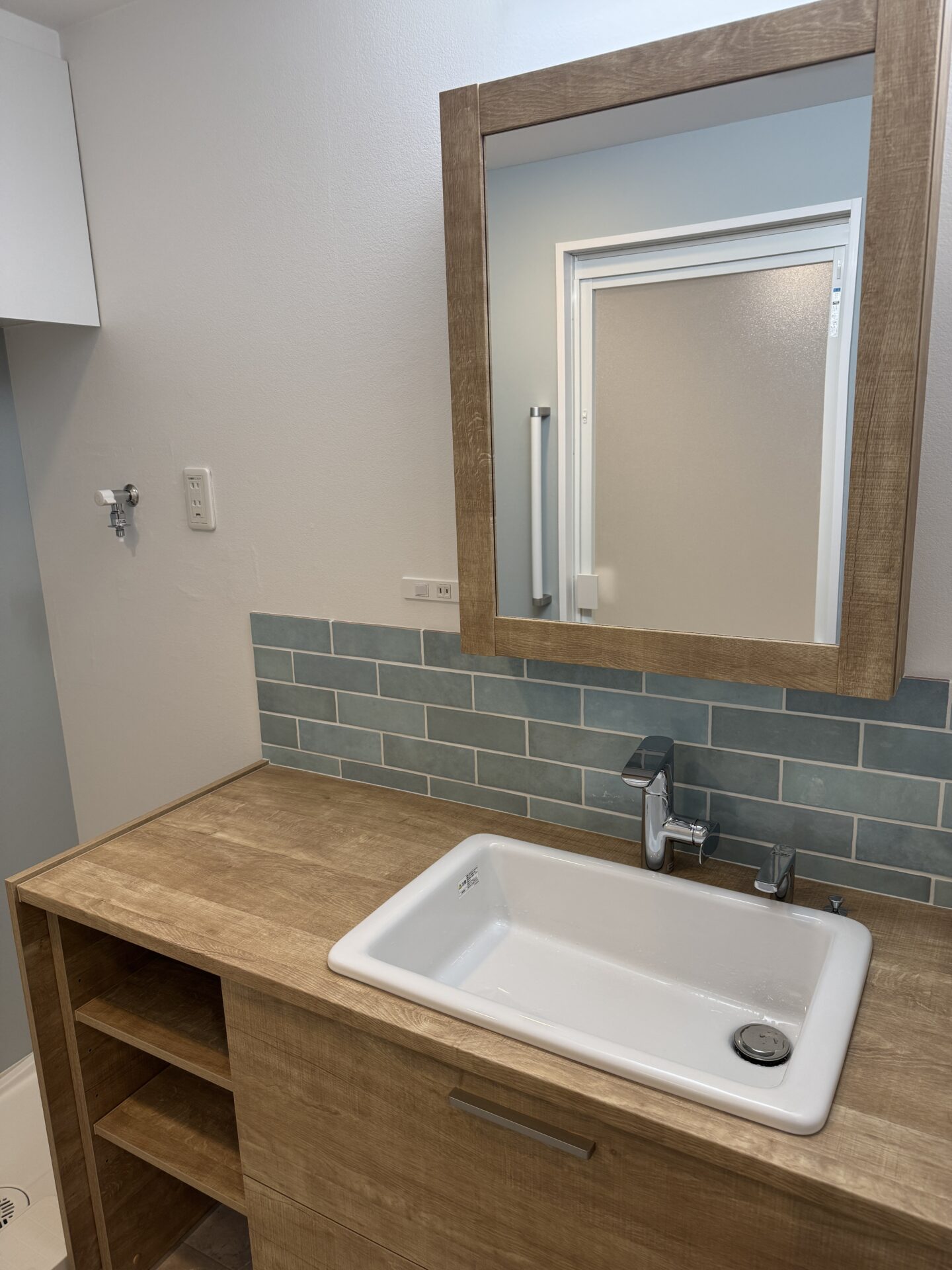 バックパネルをTOTOのパネルではなくこちらも、素材感のあるタイルを張り一段と深みができました。