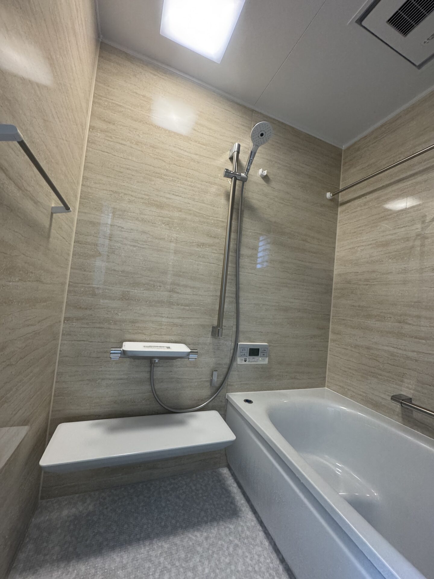 浴室は4面の壁パネルをウッド調にそろえる事で高級感を演出。