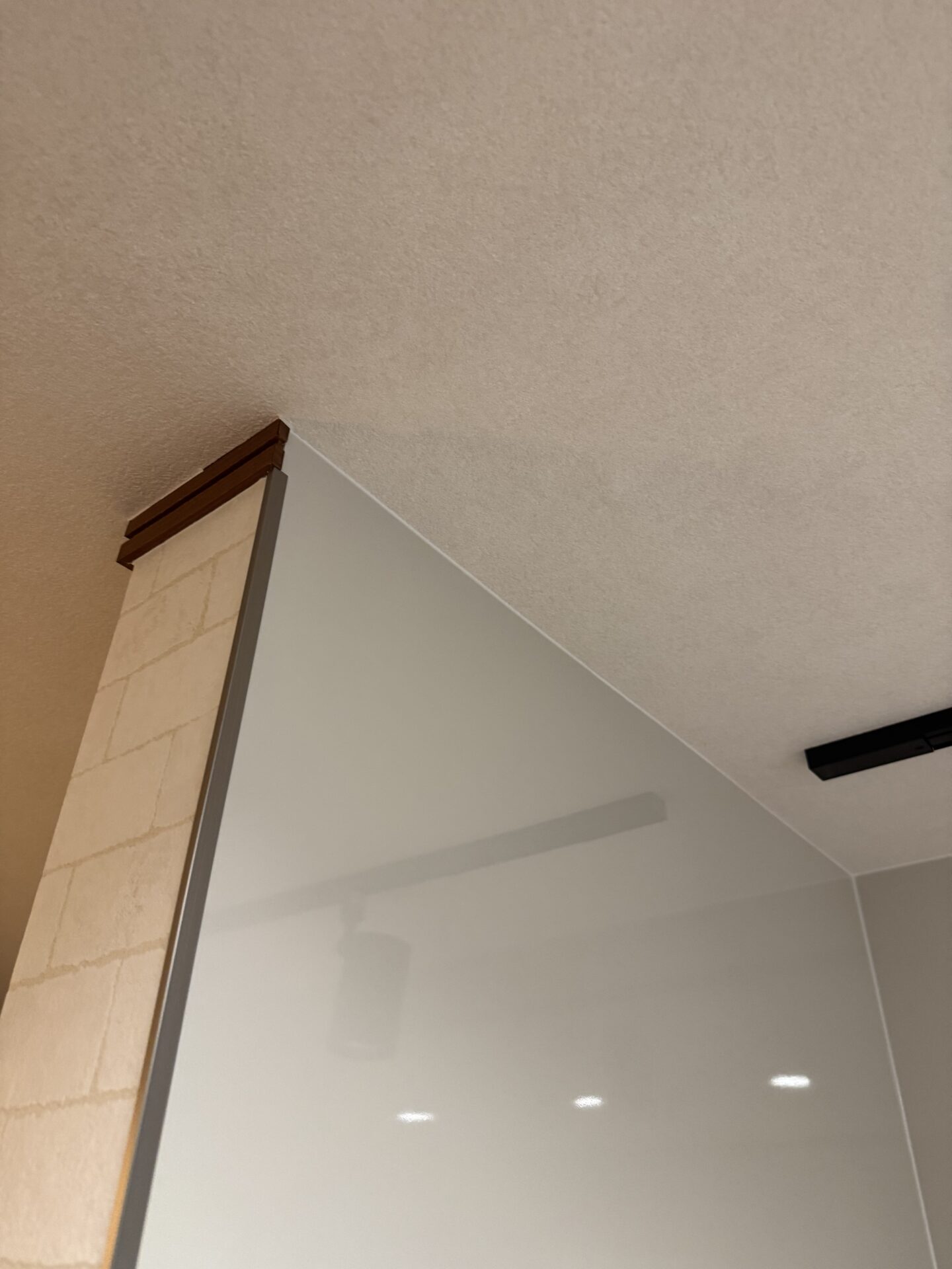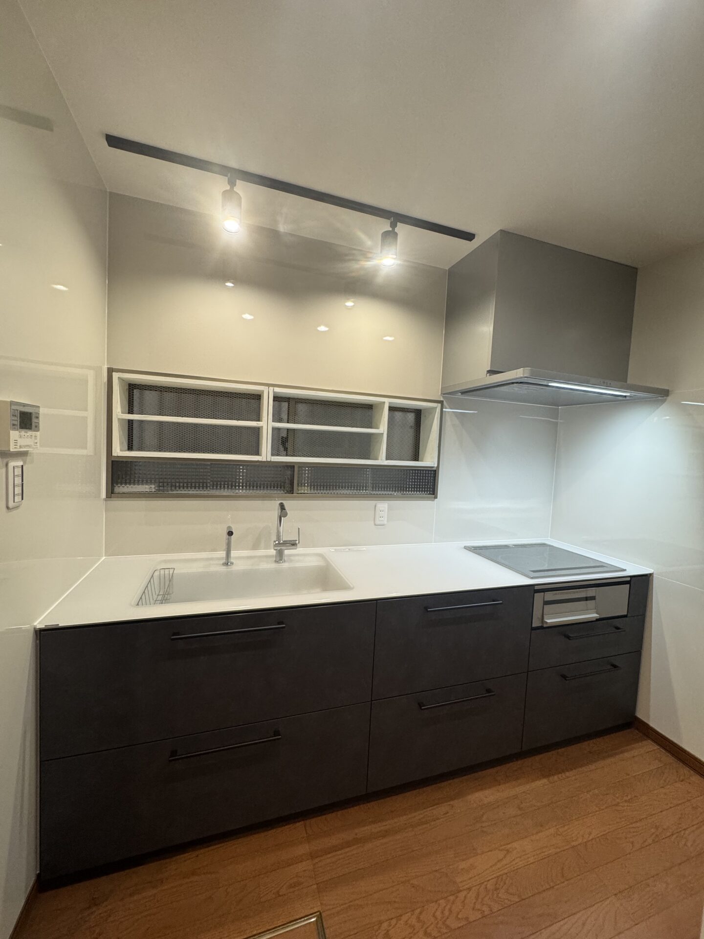 吊り戸を無くしたことで天井に手元照明として、ダクトレールとスポットライトの設置をご提案させて頂きました。キッチンの照明は従来の照明からダウンライトに変更し、雰囲気あるお洒落な空間と、調理中の手元の明るさも確保しました。