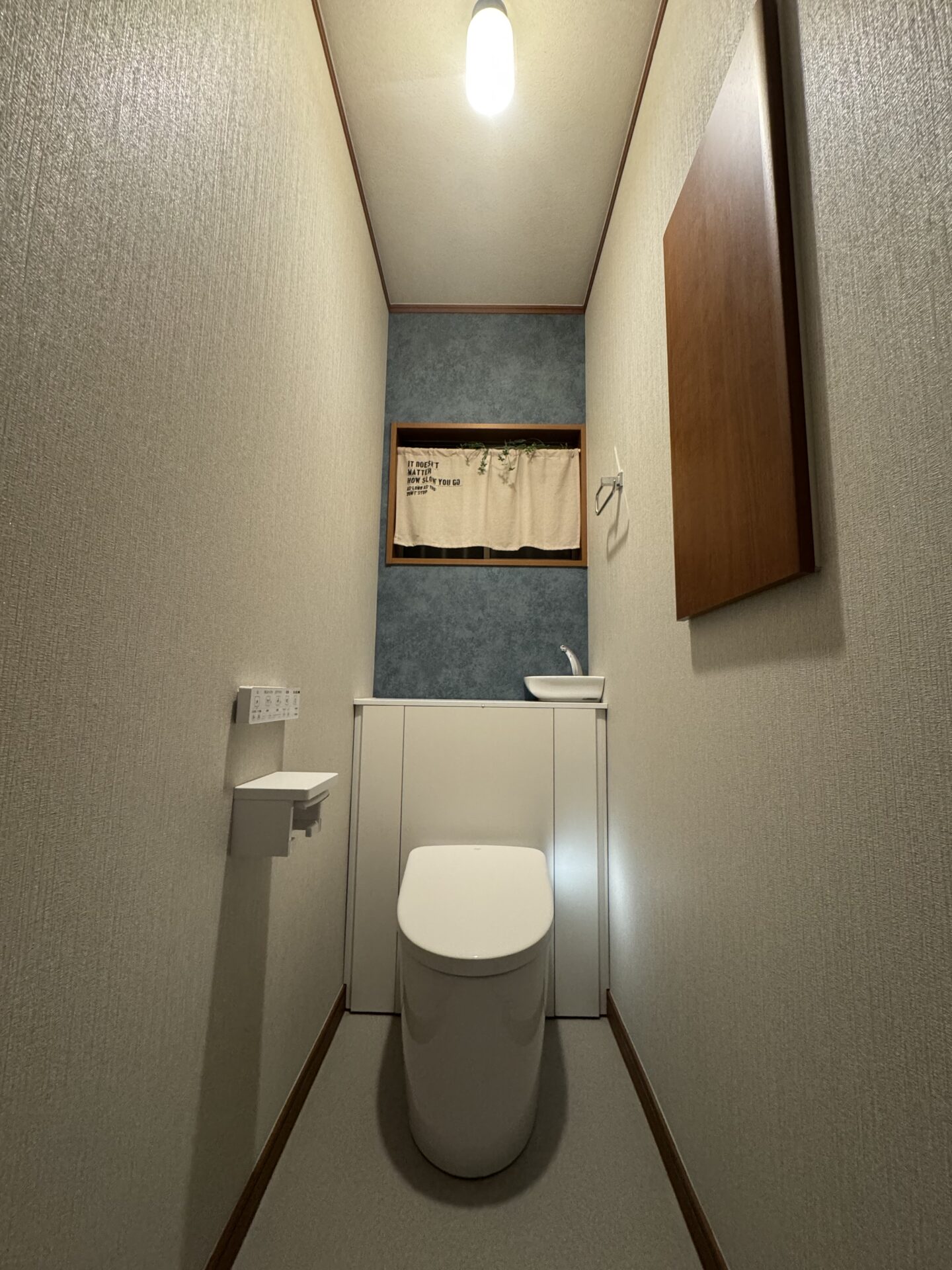 トイレは収納一体型のレストパルに。タンクは背面のキャビネットに隠されているのですっきりとした空間に。キャビネットにはトイレットペーパーや掃除用具も収納できます。