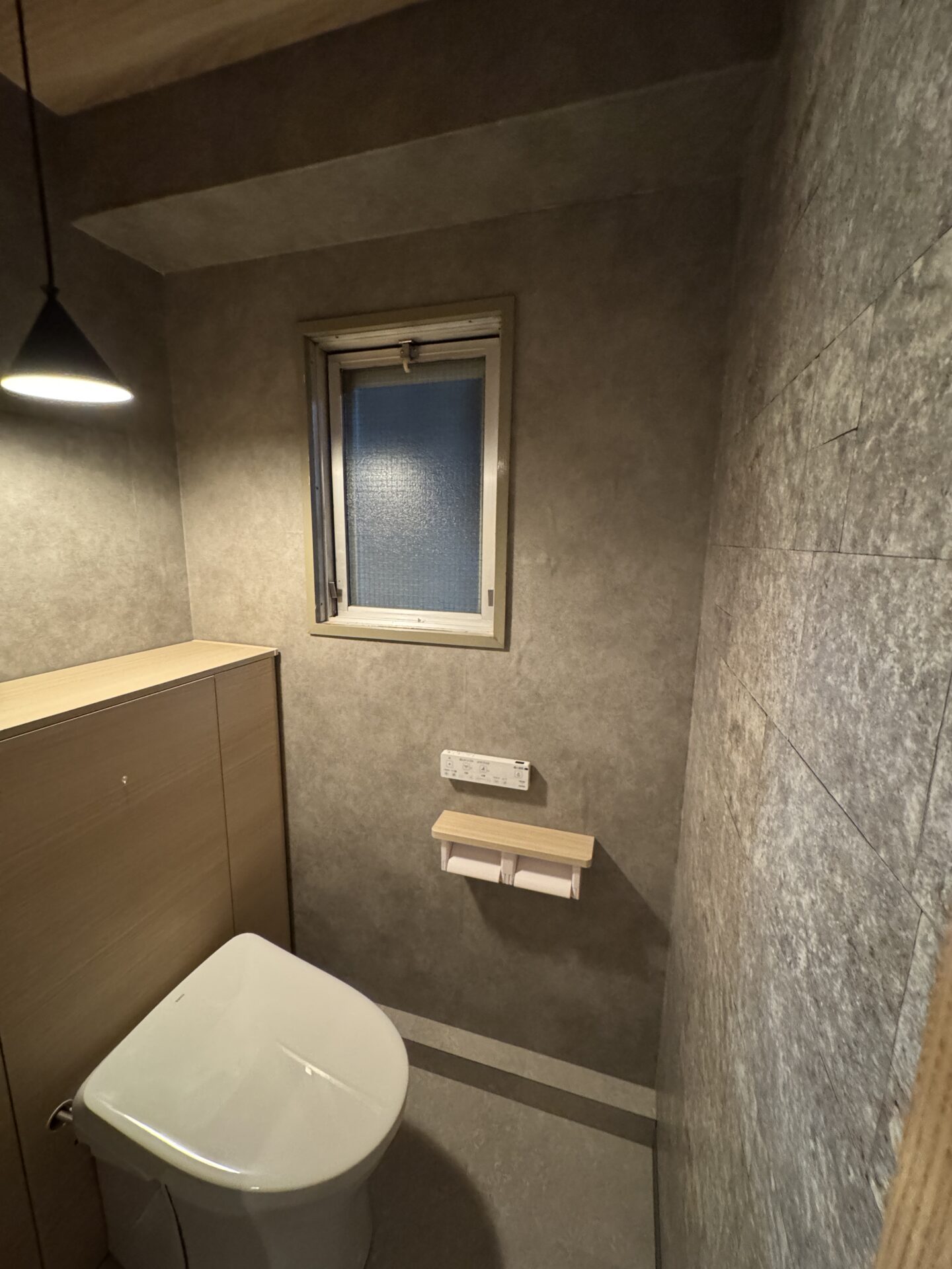 トイレはタンクがキャビネット内に収納されているレストパルに。キャビネットの木目と壁のグレーの組み合わせで温かみがありながらシンプルモダンな雰囲気になりました。浴室の壁パネルにはグレイッシュウォルナットを全面にはっているので高級感があります。ホッカラリ床と魔法瓶浴槽で寒い時期の入浴も安心です。