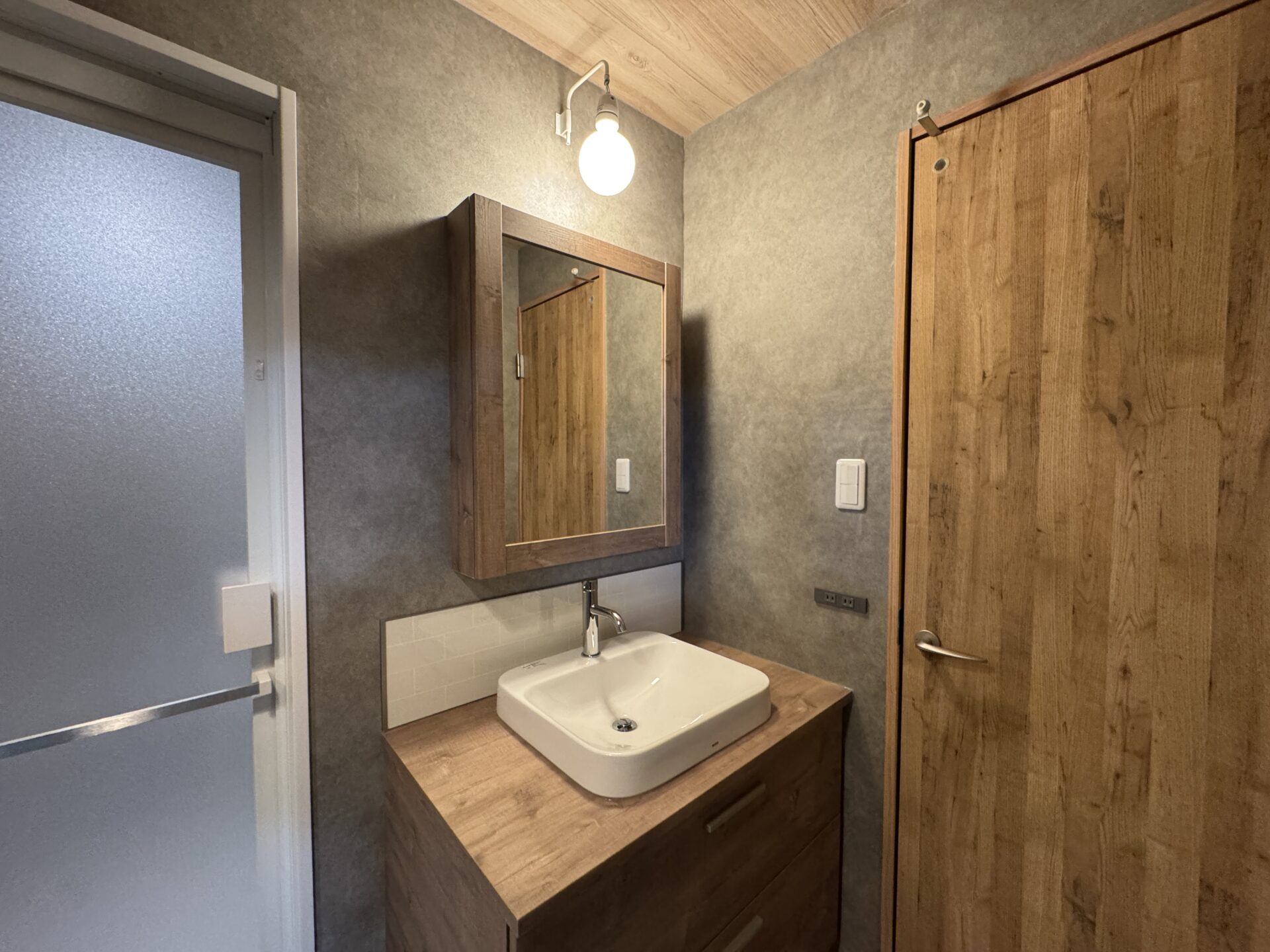 洗面化粧台はまるで造作のようなデザインが楽しめるドレーナに。ラフスモークウッドの色目がお洒落です。