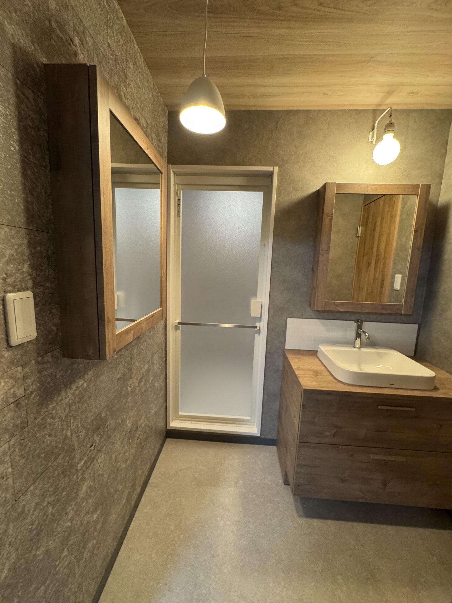 奥様の選定で洗面スペースにはシックなグレー、天井には暗すぎないウッド調の壁紙を洗面所に選ばれました。照明は脱衣スペースにはペンダントライト、鏡上にはブラケットライトを設置。ホテルライクで大人っぽいナチュラルモダンなインテリアに仕上がりました。間接照明の光も柔らかでリラックスできる空間作りに一役買っています。