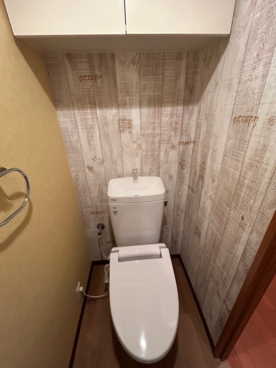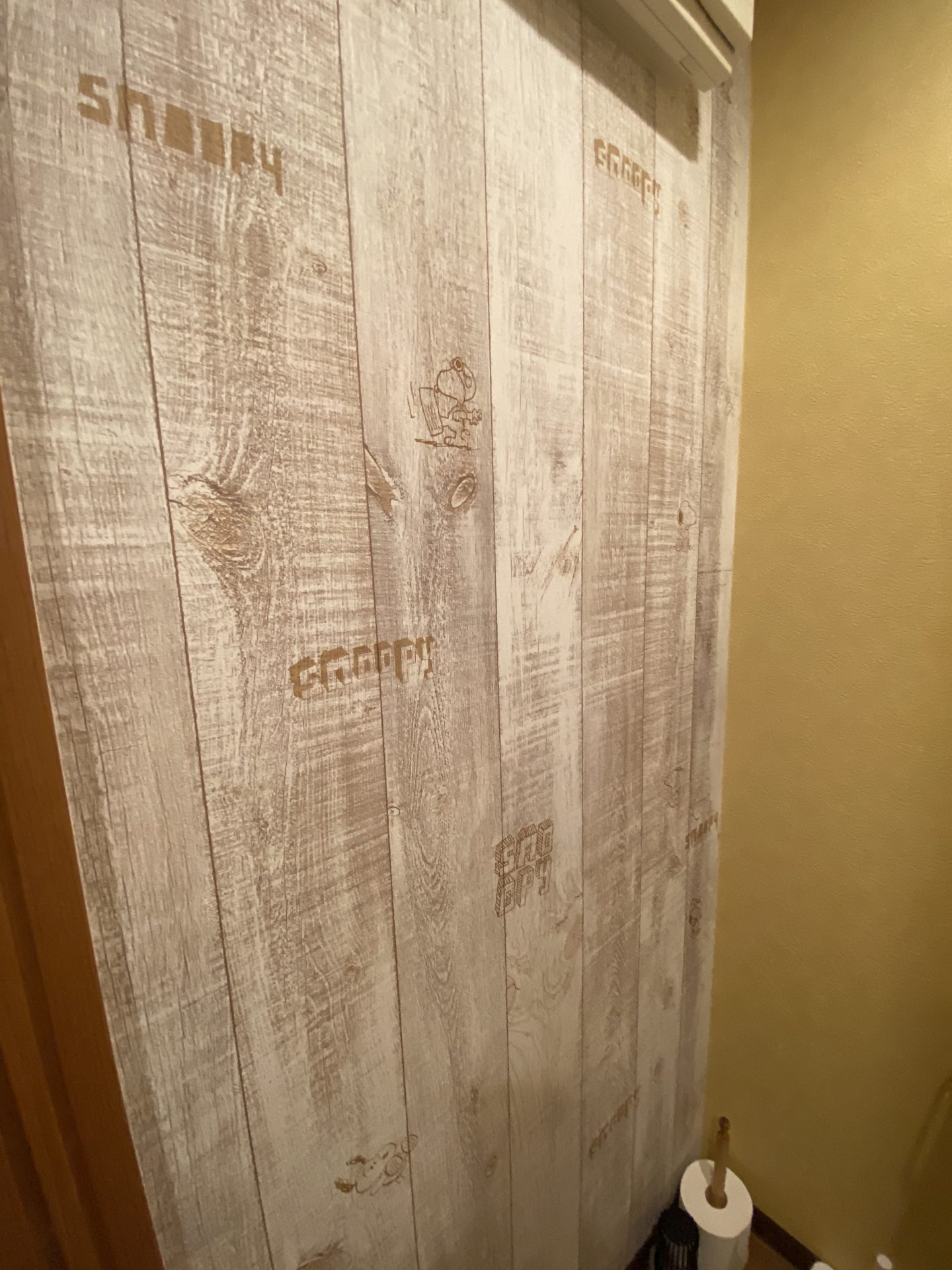 シャビーな木目柄は、よく見るとスヌーピーが隠れてます。
